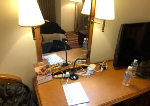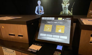 “変な”ところといえば、このホテル、受付は無人で、恐竜や侍の映像が応対してくれる演出があります。連日の試験で疲れた子供に、一瞬の気分転換になっていました。