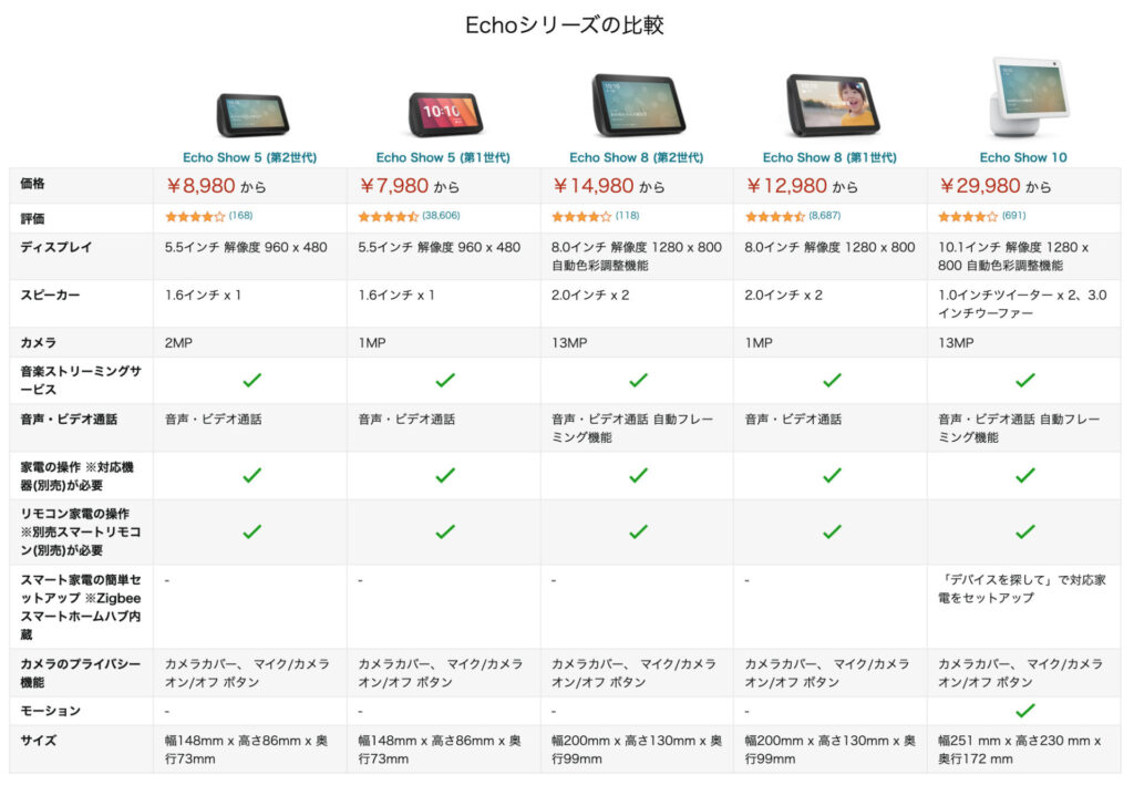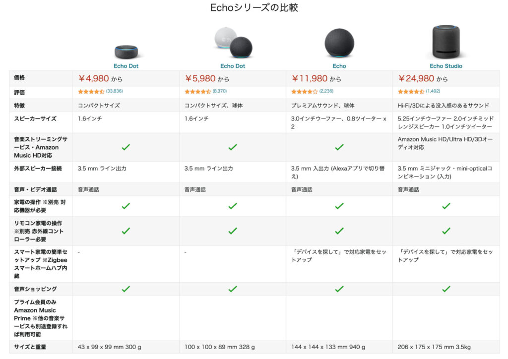 Amazonサイトから比較表を拝借。現在のラインナップはこんな感じ。世代も価格もいろいろ。まずはお試しならコンパクトで値段も安い「Echo Dot」から始めてみてもよいでしょう。