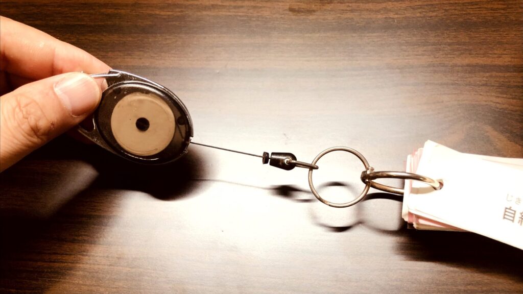 ウチではカバンでもどこにでもぶらさげられるように、100均のリール付きのキーボルダーを組み合わせて愛用しています。