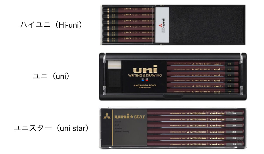理由は、ユニは3種類の鉛筆がありますが、いずれも 六角の形・太さ・長さが同じで、異なるのは芯の品質。