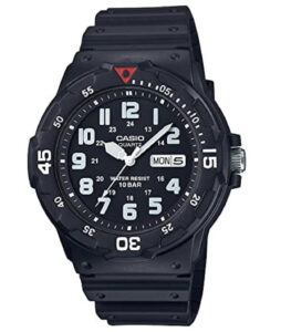 この時計は中学受験の男子が非常によくつけている腕時計です。よく、デジタルかアナログかという質問がありますが、子どもが慣れているほうでよいのですが、実際の入試会場ではスマホもタイマーも持ち込めず(テーブルに置けず)、腕時計で時間を管理します。そうなれば時刻とテスト時間がすぐにわかるアナログがオススメですし、”チープカシオ”と呼ばれる中でもこの時計が人気である理由は、“ベゼルがついている”からです。ベゼルというのは、文字盤やムーブメントを守る「風防ガラス」の周囲に取り付けられる、リング型の部品のこと。この数字入りのリングをグルグル回して、テストの残り時間を理解し、テスト問題攻略の方針を立てたりする、非常に重要なアイテムです。